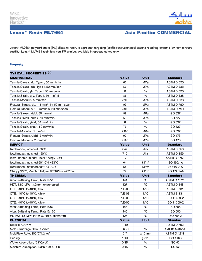 “Lexan ML7664 resin是一种聚碳酸酯(PC)材料,加工方式为:型材挤出成型。
