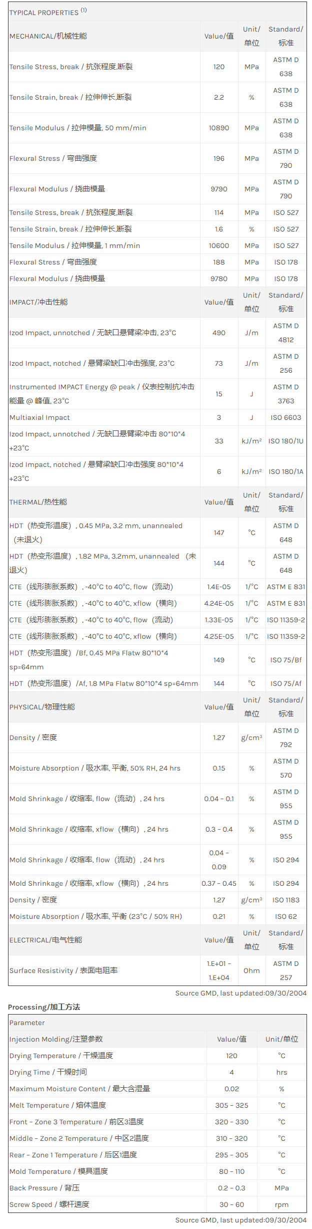 “LNP STAT-KON DE004是一种聚碳酸酯(PC)材料,含有的填充物为碳纤维增强材料,加工方式为:注射成型。